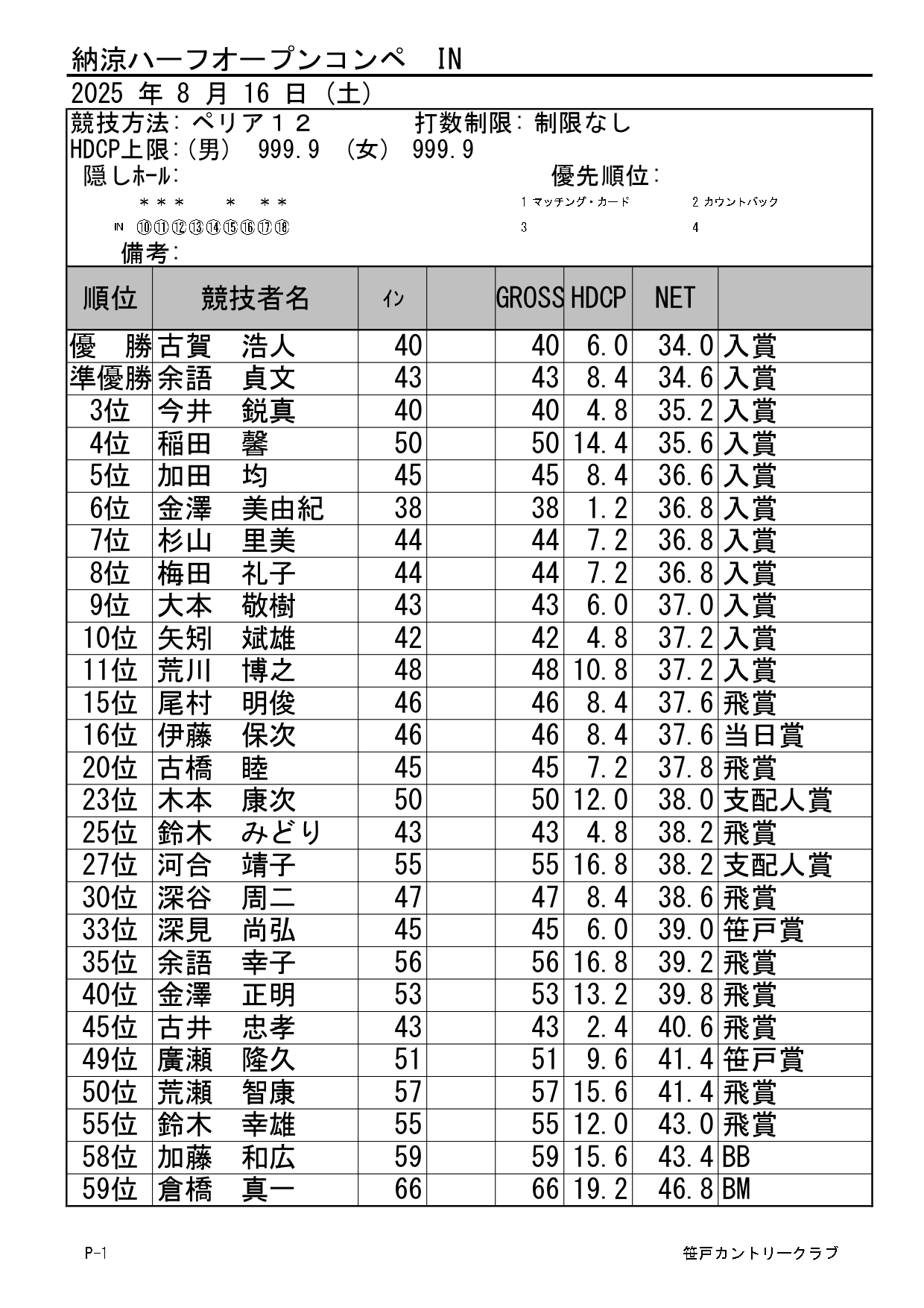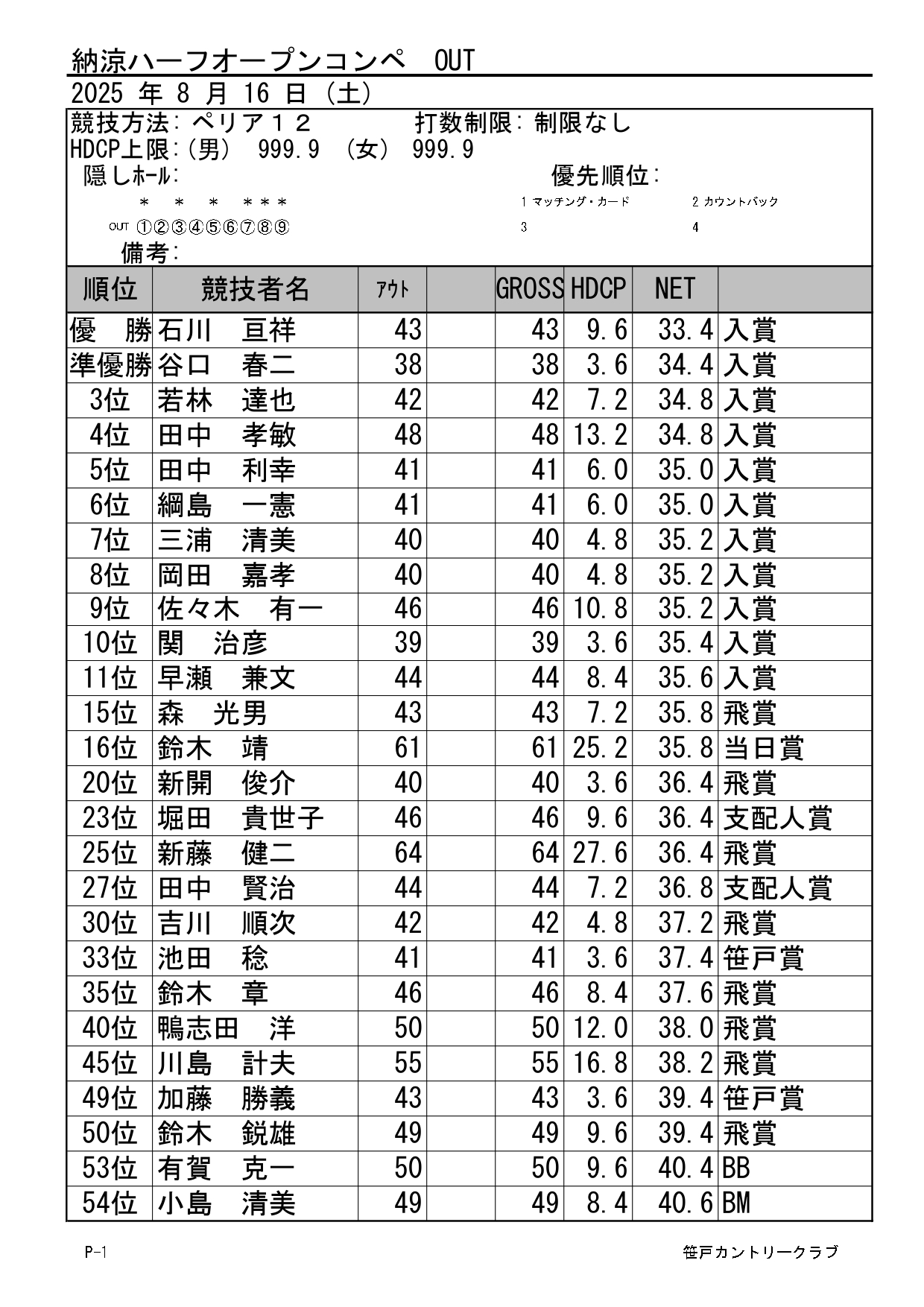 納涼ハーフオープンコンペ | 2025/08/16 | OUT | IN |