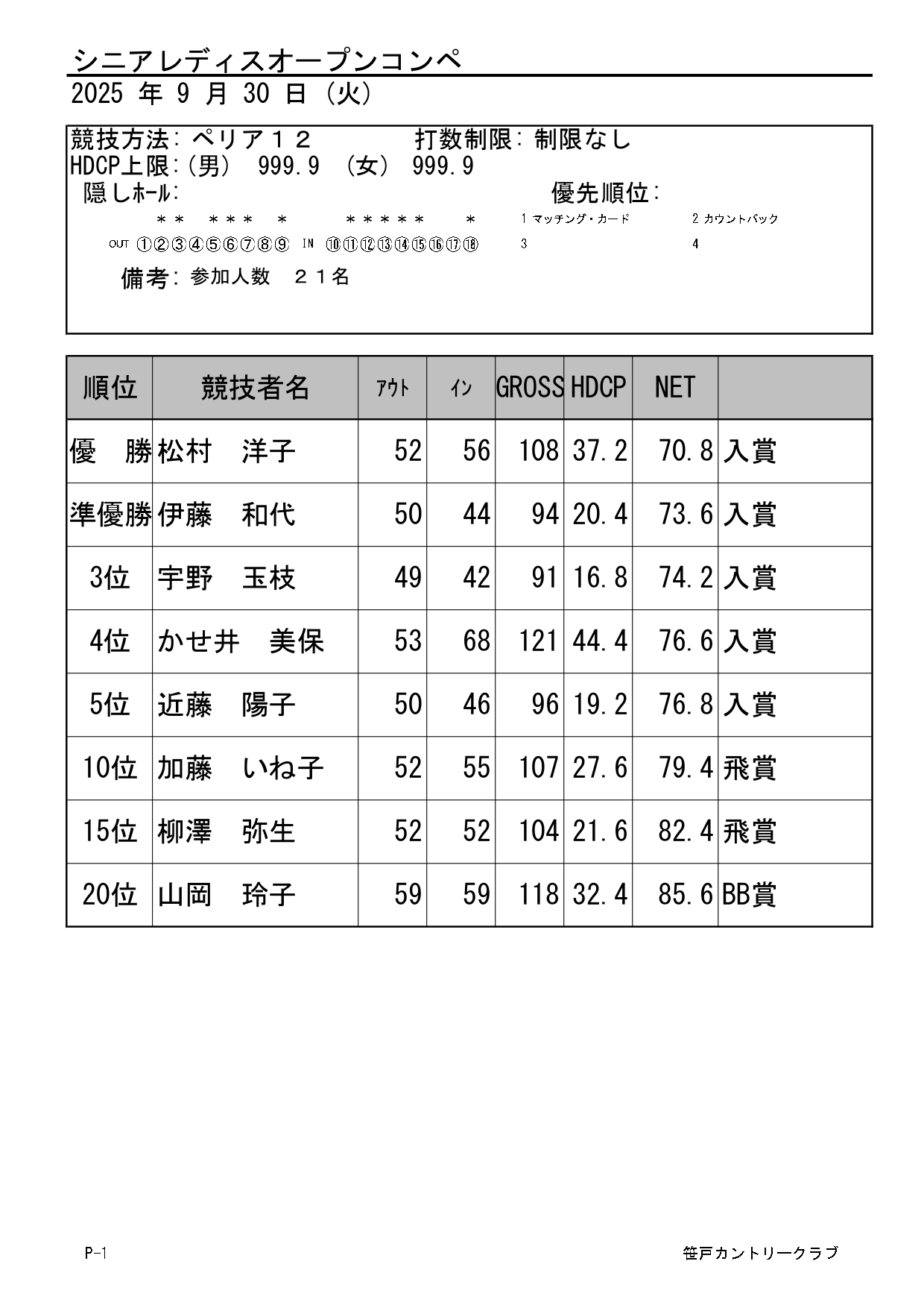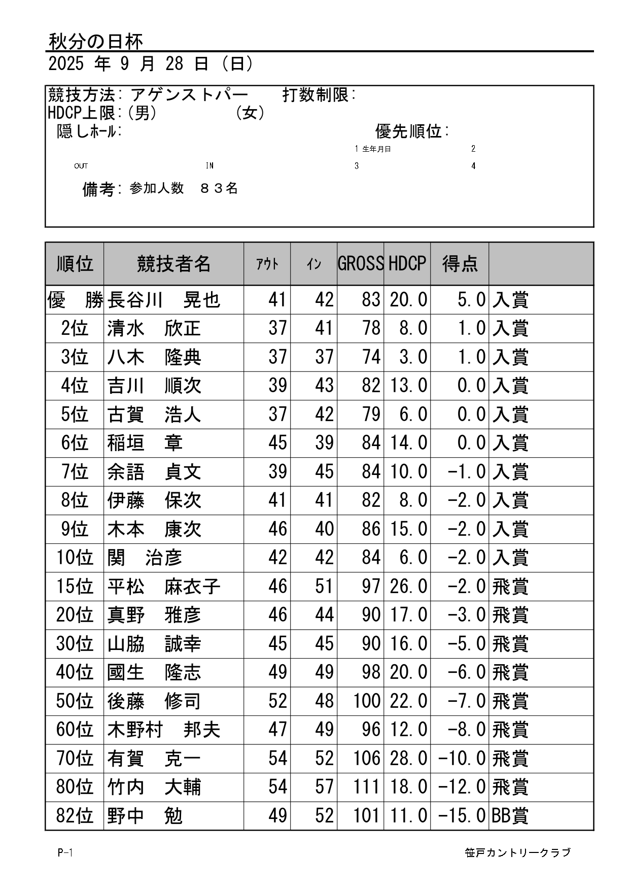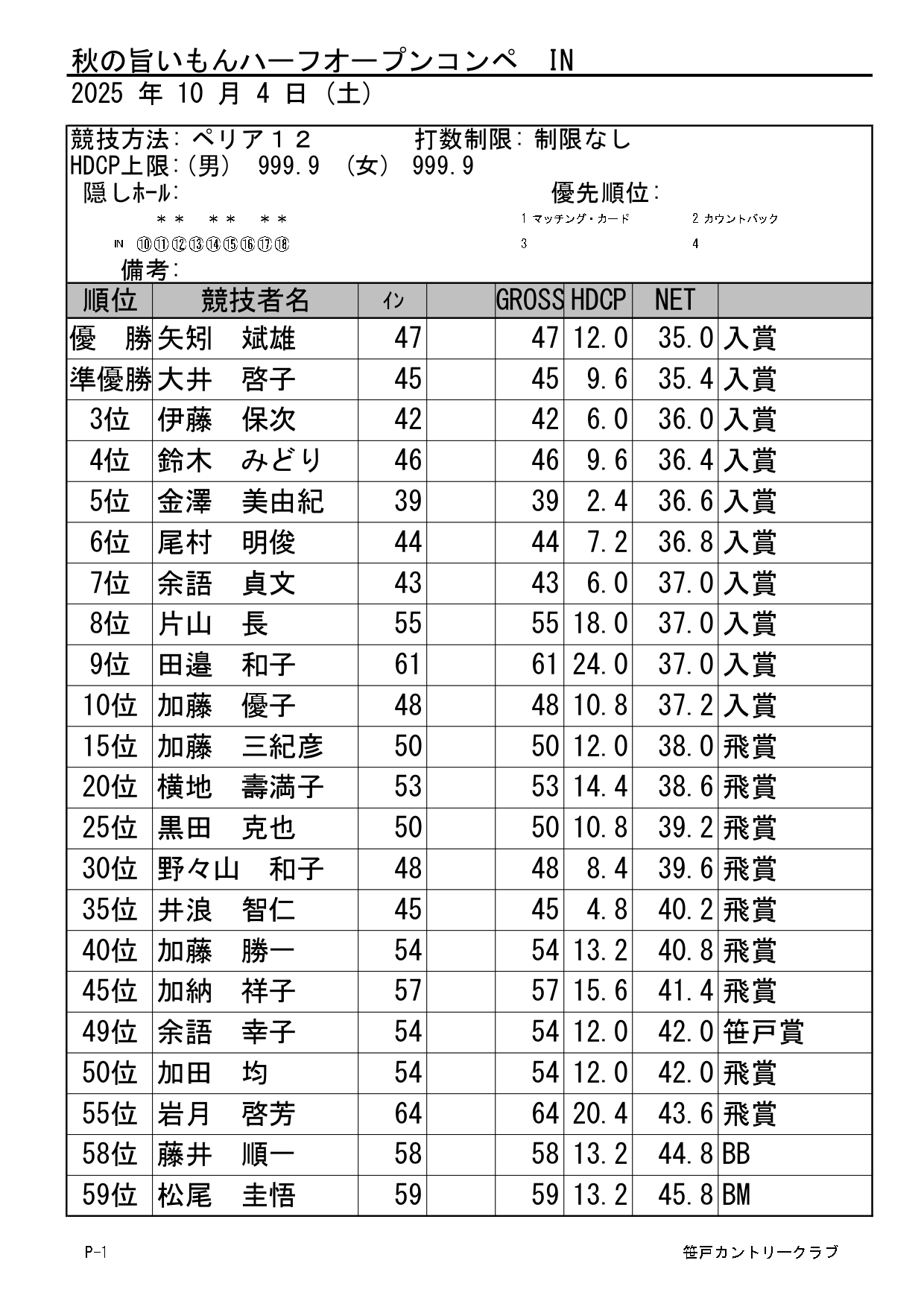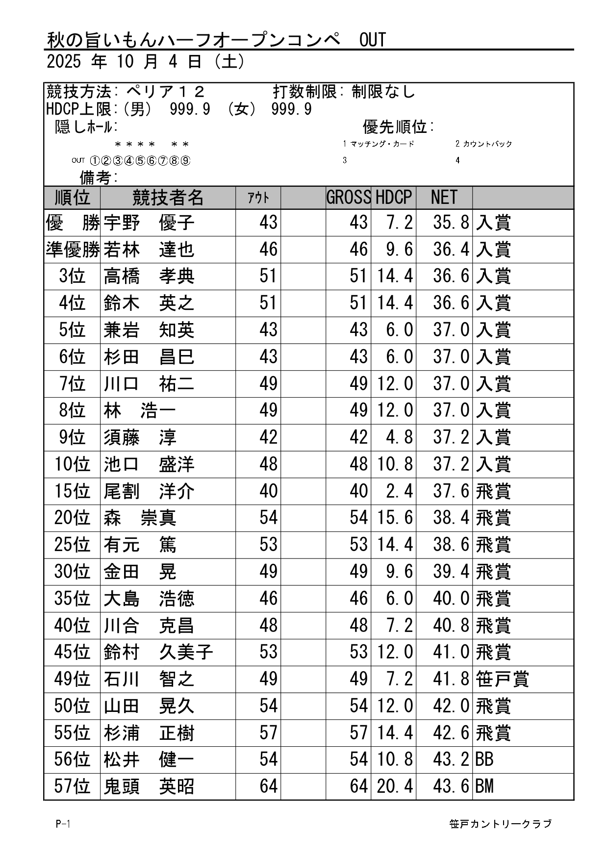 秋の旨いもんハーフオープンコンペ | 2025/10/04 | OUT | IN |