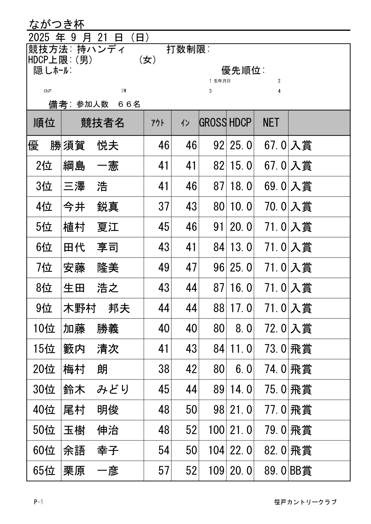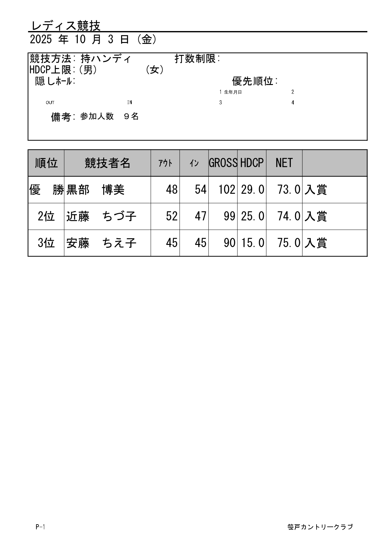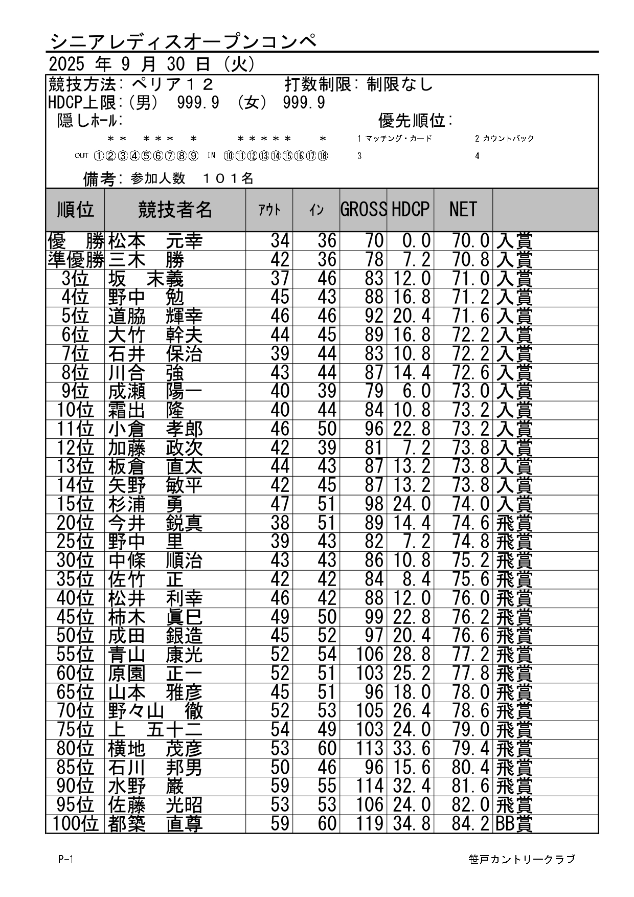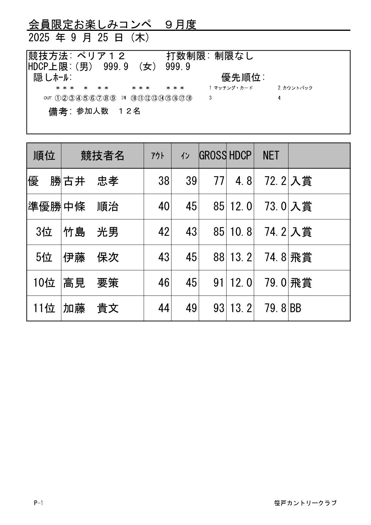 秋の旨いもんハーフオープンコンペ | 2025/10/04 | OUT | IN |