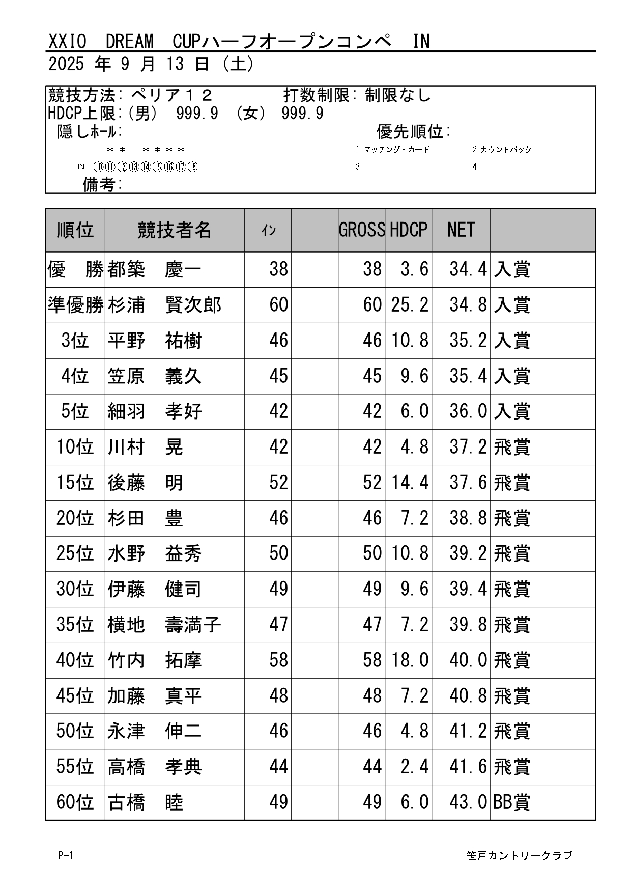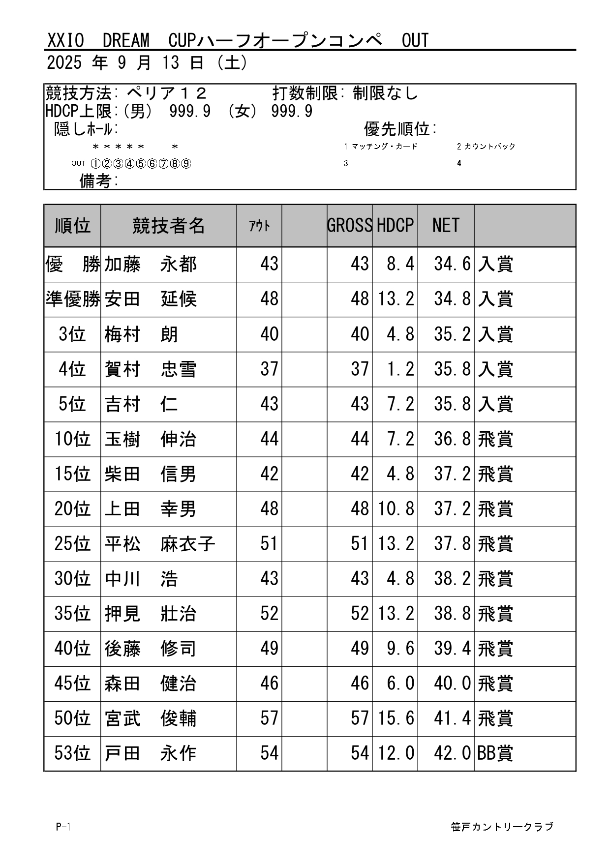 XXIO DREAM CUPハーフオープンコンペ | 2025/09/13 | OUT | IN |